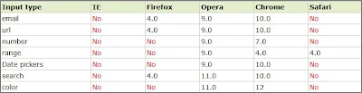 | Table showing browser support for HTML5 Input types from W3Schools.com |